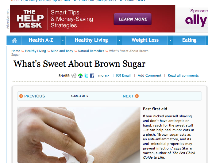 For a story on the natural benefits of brown sugar, I was quoted in the “Fast first aid” segment. Here’s the online link (page 3), but it was in the print magazine (September, 2011) too.