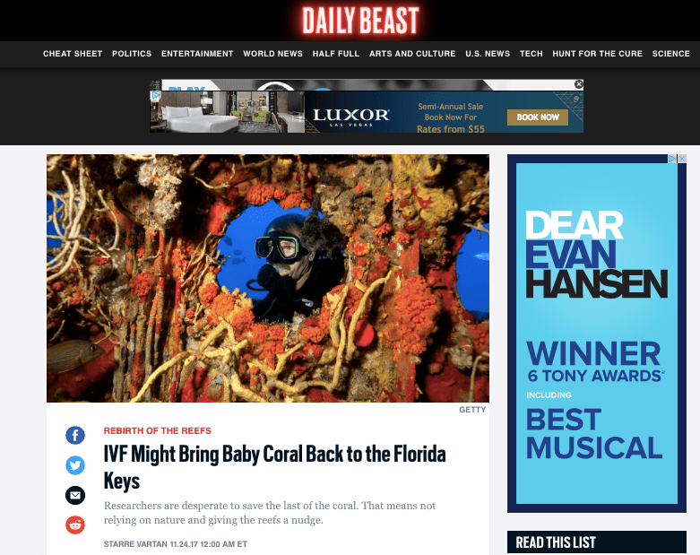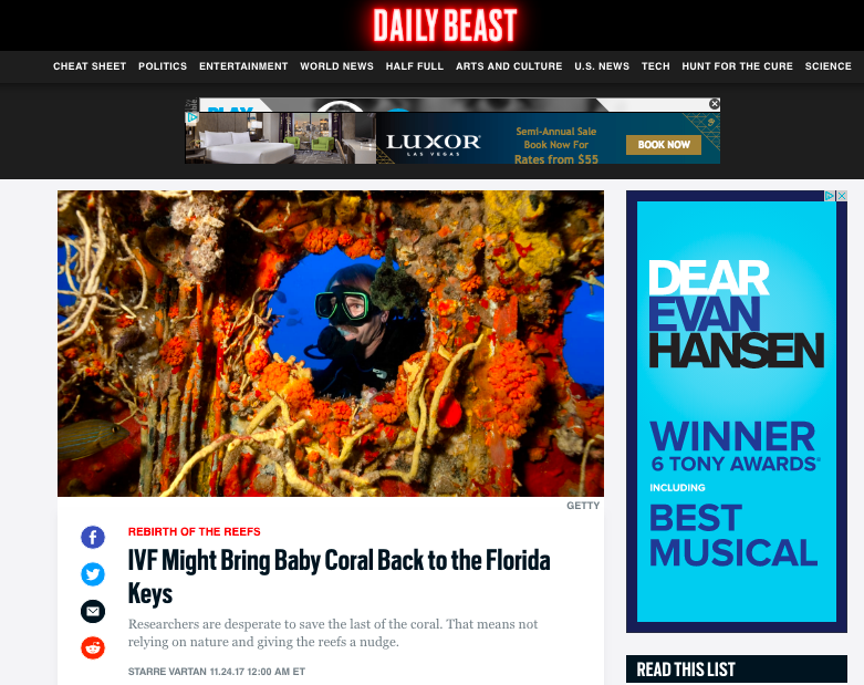 However, there’s hope. Some intrepid scientists are using some creative techniques, including IVF, to help baby coral survive a challenging new landscape. I got to talk to them for this article for The Daily Beast.