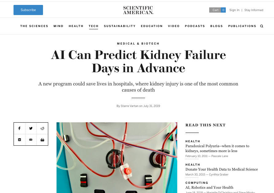 “Researchers at DeepMind Health, a subsidiary of Google’s artificial-intelligence company DeepMind, and their colleagues…designed an artificial-intelligence algorithm to identify factors that suggest someone is at risk of AKI—and to predict it 48 hours before it happens. The algorithm predicted overall AKI cases with 55.8 percent accuracy, but in cases severe enough to later require dialysis, the figure was 90.2 percent. The work was described in a study published Wednesday in Nature.”